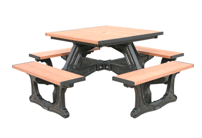 A true departure from the ordinary. A square table with an upscale design that projects prominence. The durability of 100% recycled plastic, an open access seating design, and a frame that has no peer, who could ask for more. Umbrella ready.